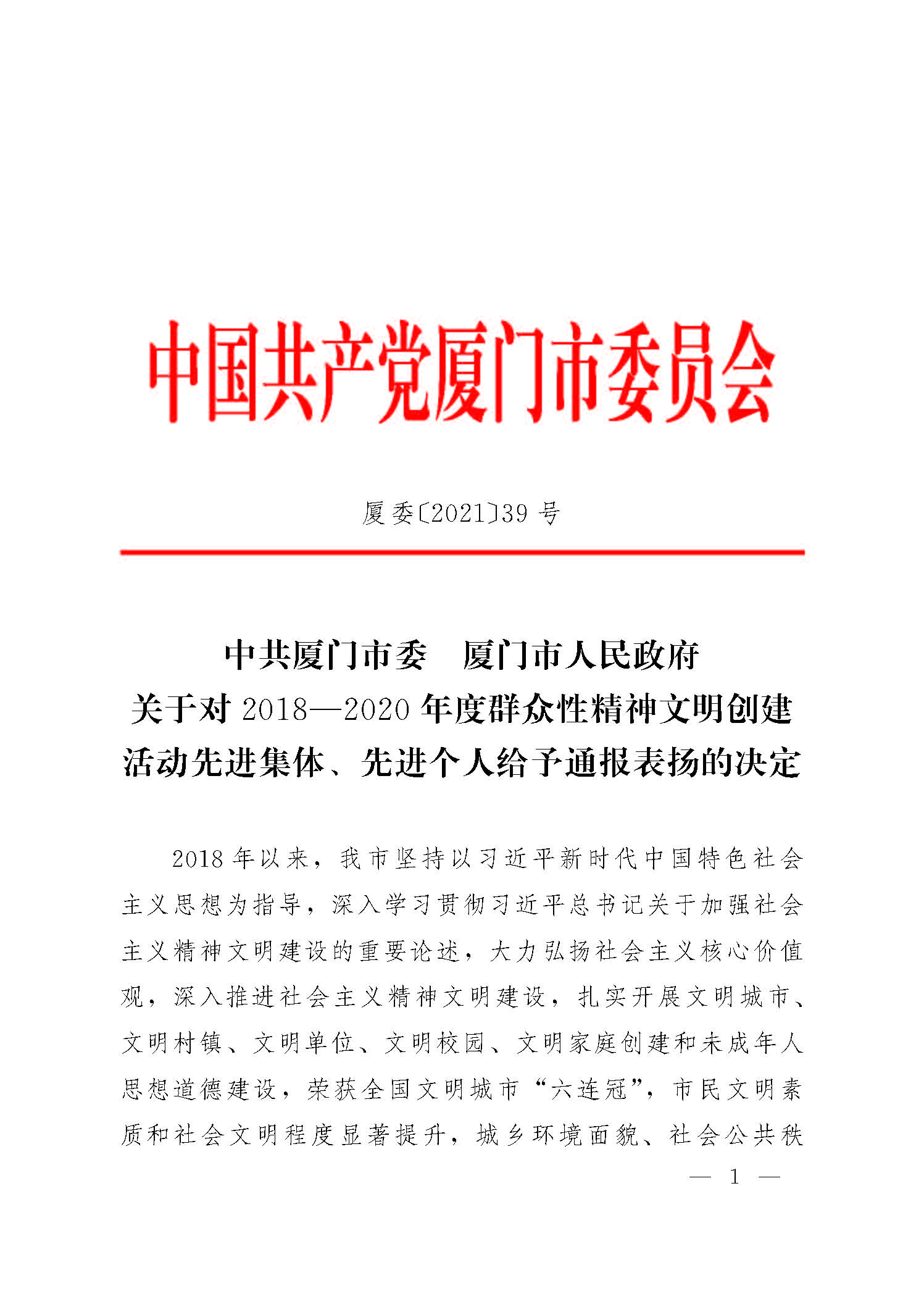 近日,中共廈門市委、廈門市人民政府發(fā)布了《關于對2018—2020年度群眾性精神文明創(chuàng)建活動先進集體、先進個人給予通報表揚的決定》,對在2018-2020年度精神文明各類創(chuàng)建活動考評推薦工作中考核達標的、表現突出、成效顯著的市級文明集體、個人進行通報表揚,其中,廈門恒興物業(yè)服務有限責任公司榮獲“廈門市文明單位”稱號。
