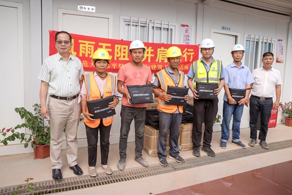 廈門恒興集團(tuán)工會(huì)主席、學(xué)校項(xiàng)目后勤組組長(zhǎng)洪超生代表學(xué)?;I建領(lǐng)導(dǎo)小組,向現(xiàn)場(chǎng)建筑工人贈(zèng)送了雨衣,并向他們的辛苦付出表達(dá)了謝意。他表示,為了確保學(xué)校建設(shè)項(xiàng)目如期交付,工人們從去年12月開工以來(lái)始終堅(jiān)守崗位,加班加點(diǎn)不辭辛苦,學(xué)校的一磚一瓦都凝結(jié)了他們的心血和汗水。作為學(xué)校建設(shè)方,希望盡可能地幫助工人解決后勤保障問(wèn)題,改善工作條件,讓工人們切身感受到溫暖和關(guān)懷。隨著氣溫升高,夏季的防暑降溫物資也將陸續(xù)提供給現(xiàn)場(chǎng)作業(yè)人員。